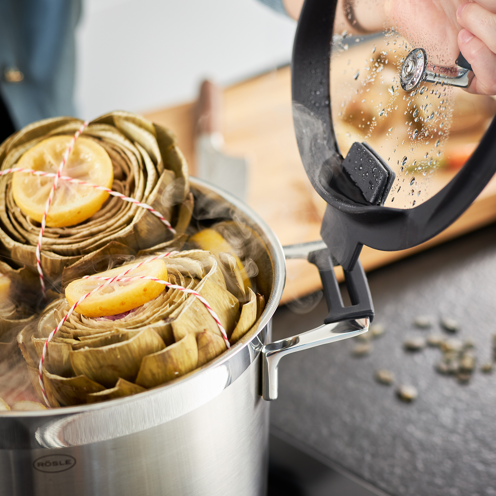 - Der innovative Deckel mit integrierter Abgießfunktion macht den Topflappen und den Seiher überflüssig. Mit zwei fixen Deckelpositionen können verschiedenste Lebensmittel abgeseiht werden: