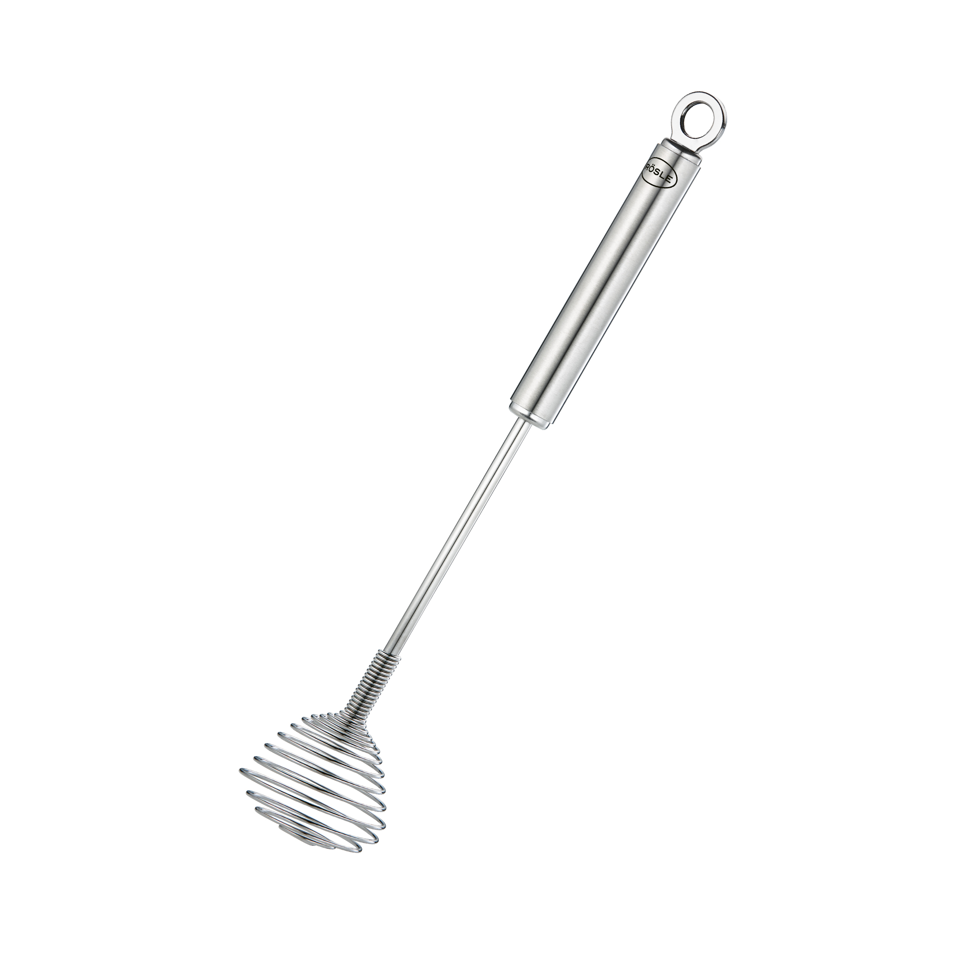 However, the elongated, round handle should be made of stainless steel for all whisks, as the cool and hygienic metal is stable and comfortable to hold. A hanging loop ensures that the whisk can be stored on the hook rail for kitchen utensils to save space and be within easy reach. The wires of the whisk should have sufficient space between them so that the whisk can be guided flexibly and cleaned easily.