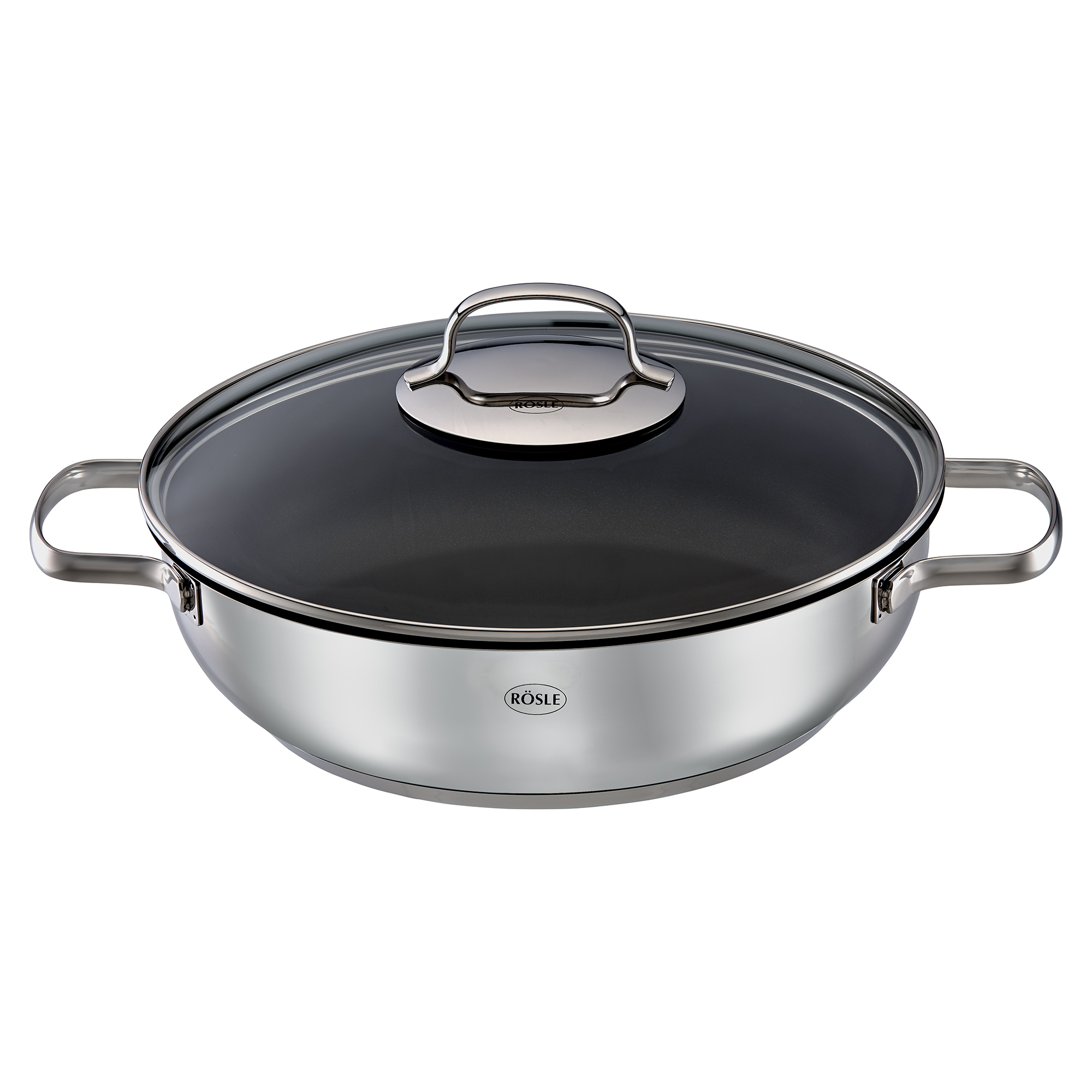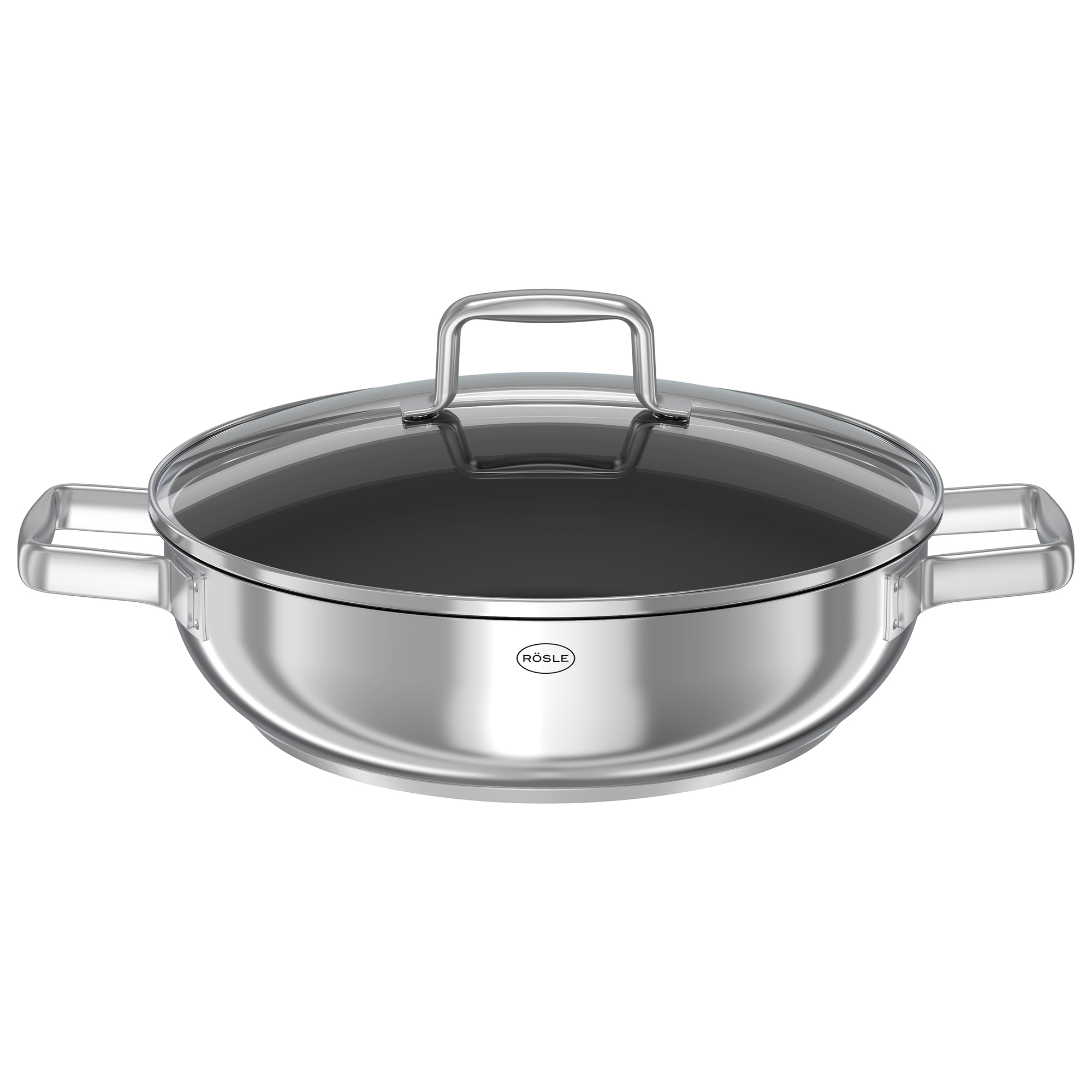 Elegance serving pan, 28 cm, made of stainless steel with glass lid and two handles.