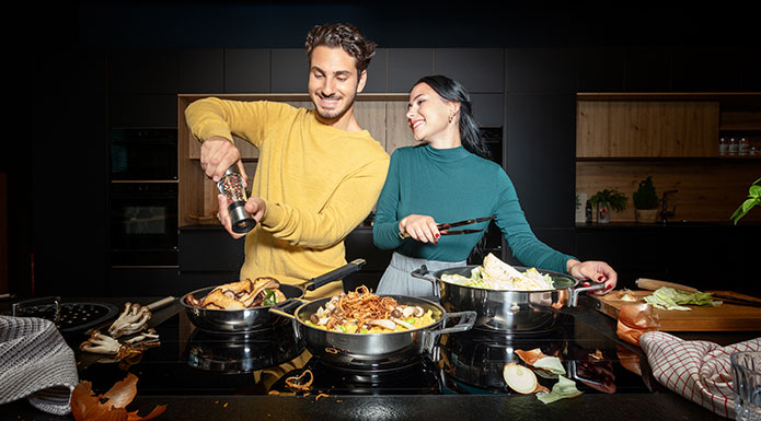 Freunde kochen zusammen mit den Pfannen und dem Wok der Kochgeschirr Serie CADINI